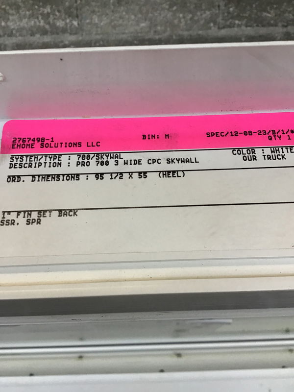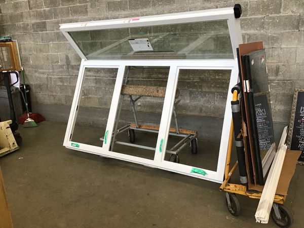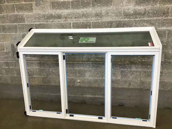 Ca. 2023 Ply Gem "Skywall" with a fixed top and center pane and casement in the lower, outside panels. We have the glass (at Customer Service) for the bottom panes, but you will need to install it. Height listed is a close estimation. I didn't plumb up the lower section to get an accurate height of the top.