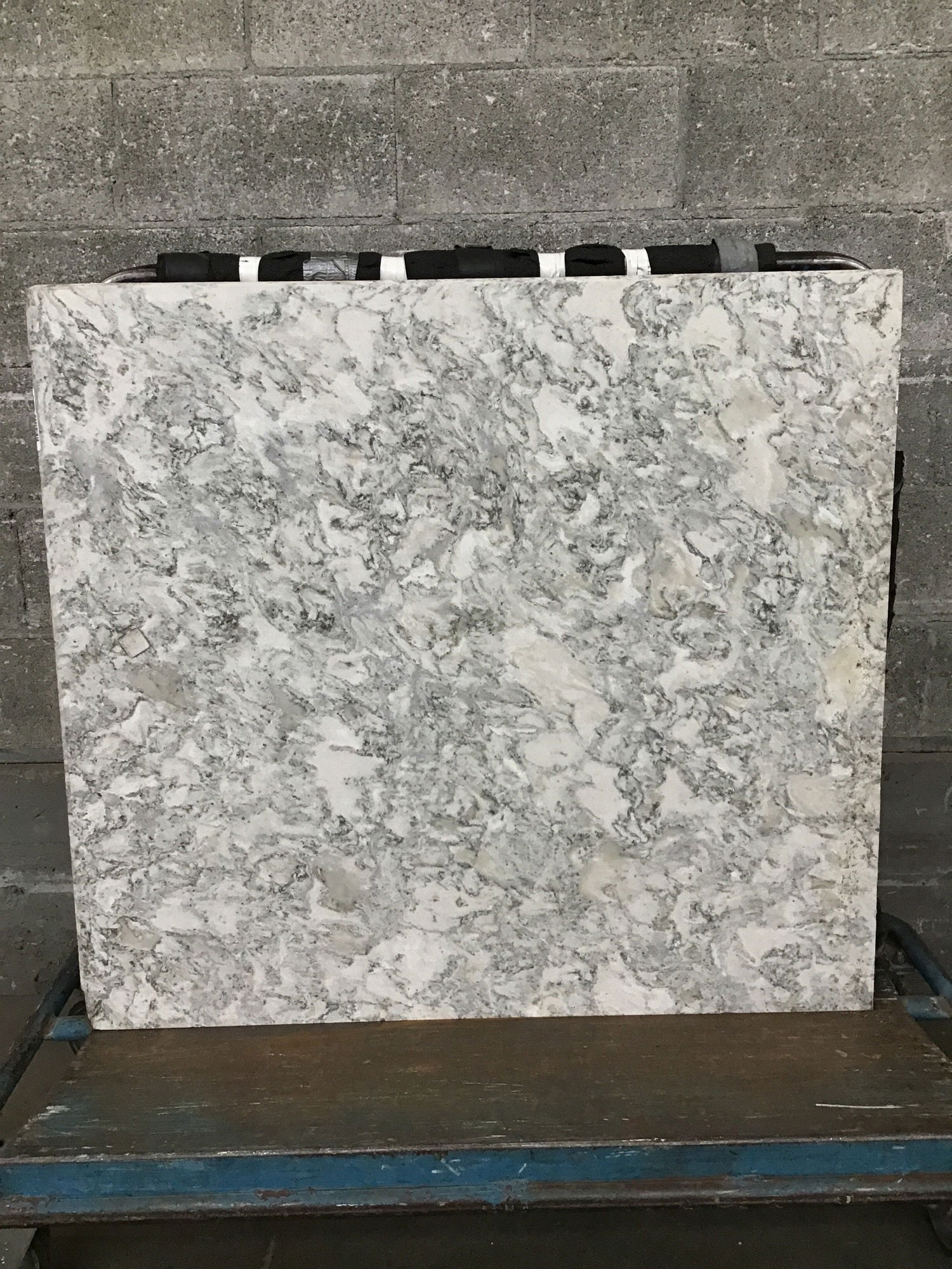 This is thick slab of quartz countertop that would be ideal for an island. Has two finished edges.
