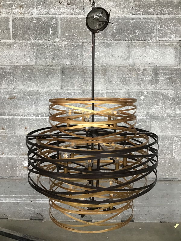 This is an 18 light chandelier by Minka-Lavery in their "Vortic Flow" collection. The finish is a mix of dark bronze and mosaic gold and the design does give off the feeling of swirling motion. Goes for $1600 new. https://lightingnewyork.com/product/lighting/ceiling-lights/chandeliers/minka-lavery-vortic-flow-chandeliers-4679-111/1284239.html