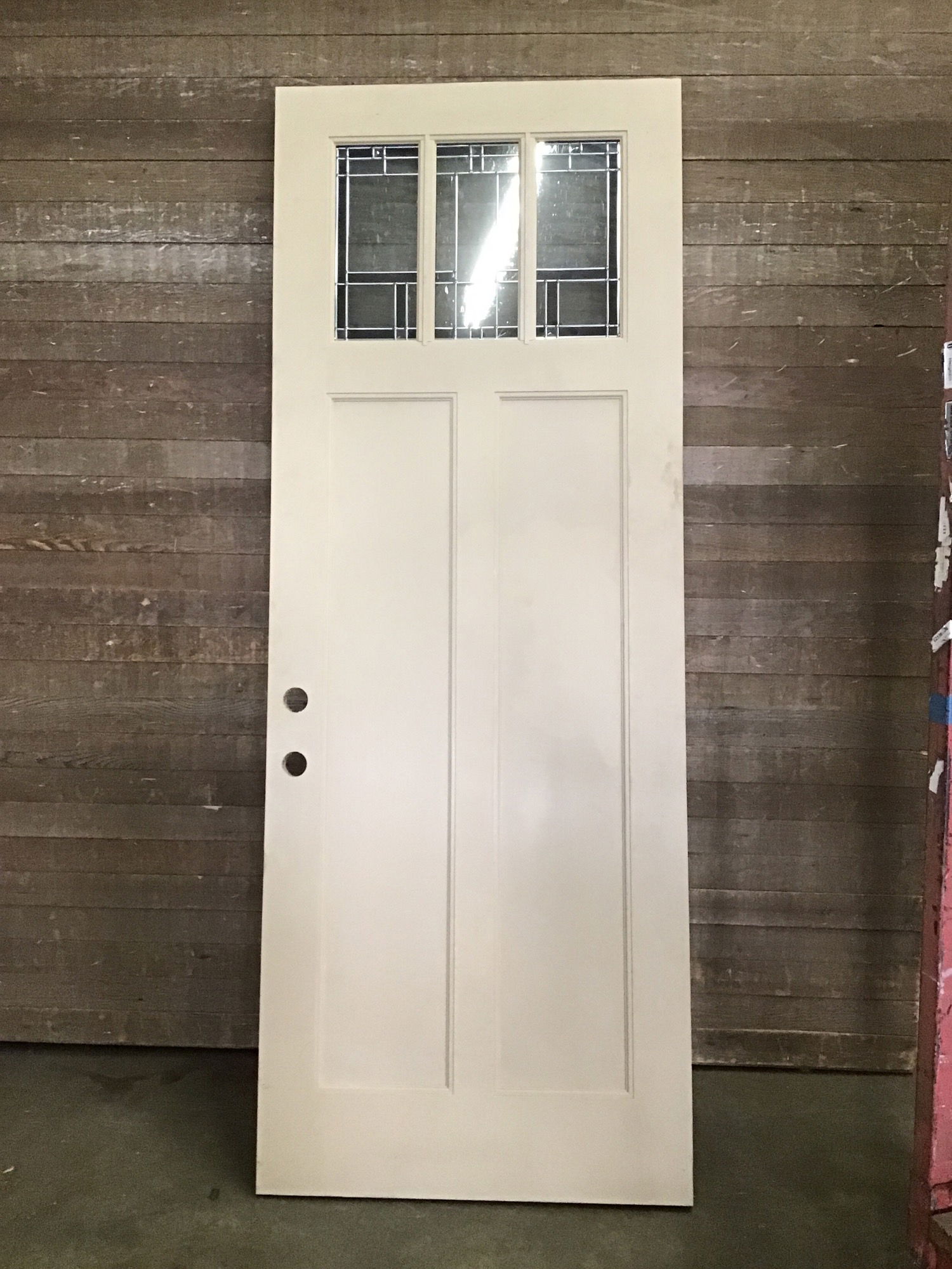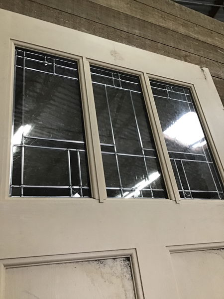 Stunning extra tall fiberglass clad exterior door. The small light at the top is leaded and obscured. It has bore holes and right hand swing hinge cuts. Might have some minor cosmetic damage otherwise in good condition!