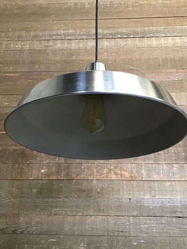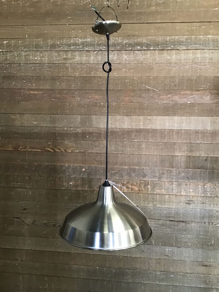 Industrial style pendant light fixture, with a brush nickel finish. Would be perfect for any modern aesthetic! Overall looks to be in good condition.