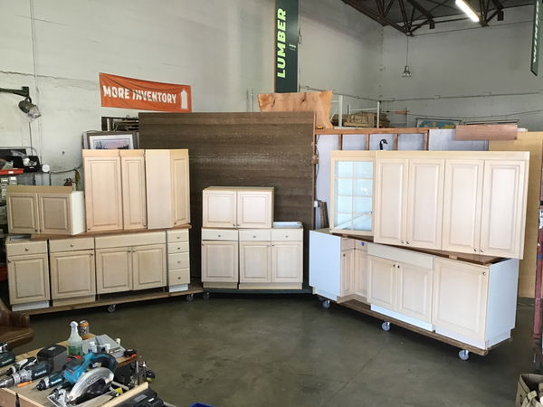 Maple faced raised cabinet set with 9 bases and 7 uppers. The set is in used but overall good condition. Featuring some beautiful glass, brushed nickel pulls, and tons of adjustable shelving. The 4 door and glass uppers could be split up as well. Your parents would have loved getting this set in 1996.