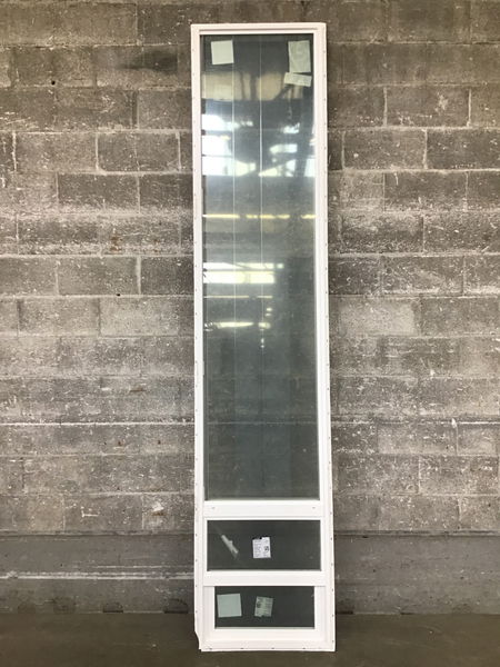Ca. 2023 Tall & narrow white vinyl fixed window with a small single hung at the bottom. Comes with an energy tag. Item may have cosmetic damage.