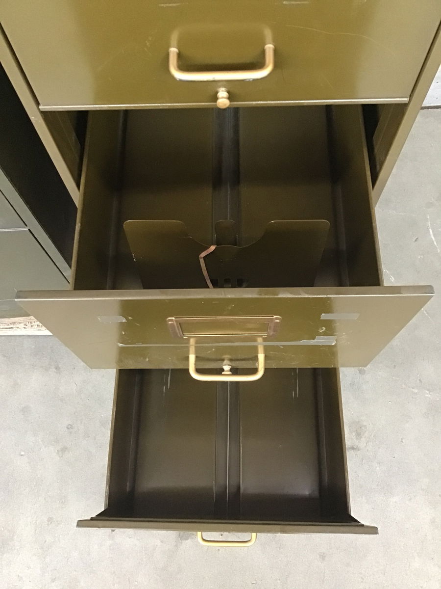Old school steel filing cabinet with a deep green paint job and bright brass accents.