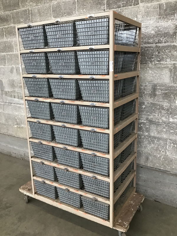 Manufactured by Frank D. Cohan Incorporated, this bank of lockers features a sturdy steel frame, slots for 48 baskets and 48 wire lockers baskets--each partially obscured with a galvanized face. The frame and lockers overlap, allowing basket contents to be secured with a padlock. The painted finish is well worn and this unit could use a good dusting. Still, this bank offers sturdy storage for a garage, shop or employee space. The baskets are the correct number for each slot.