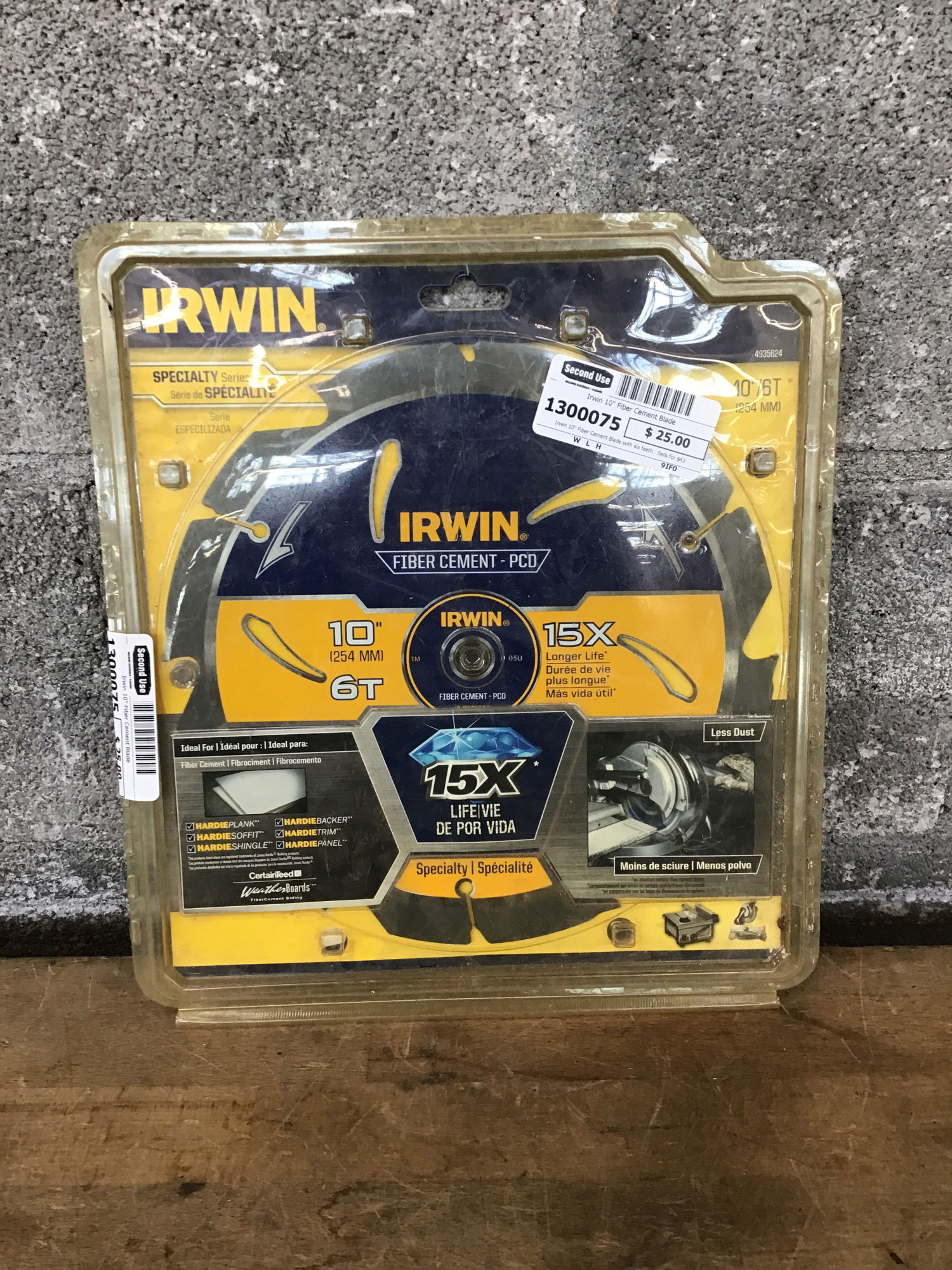 Irwin 10" Fiber Cement Blade with six teeth. Sells for $43 on amazon. If this one was used at all, it wasn't used much.