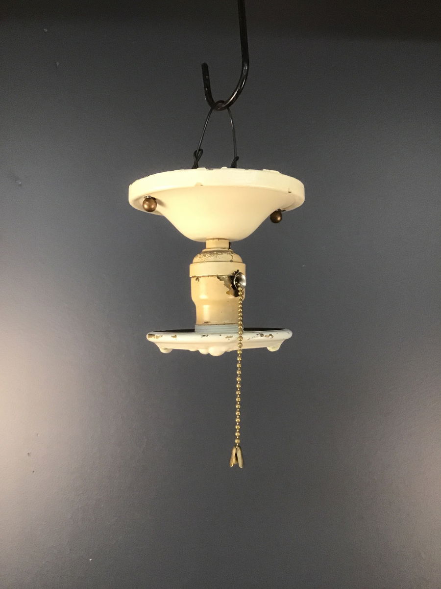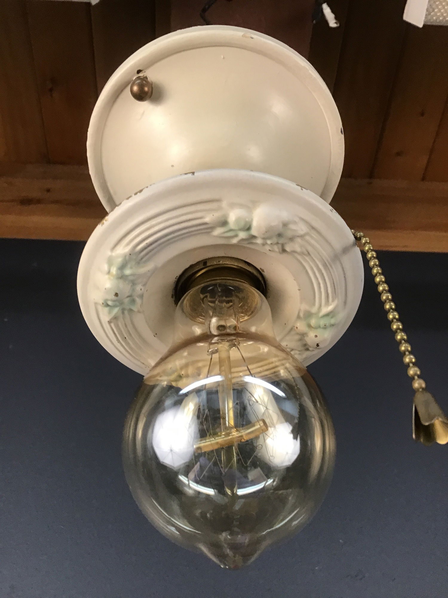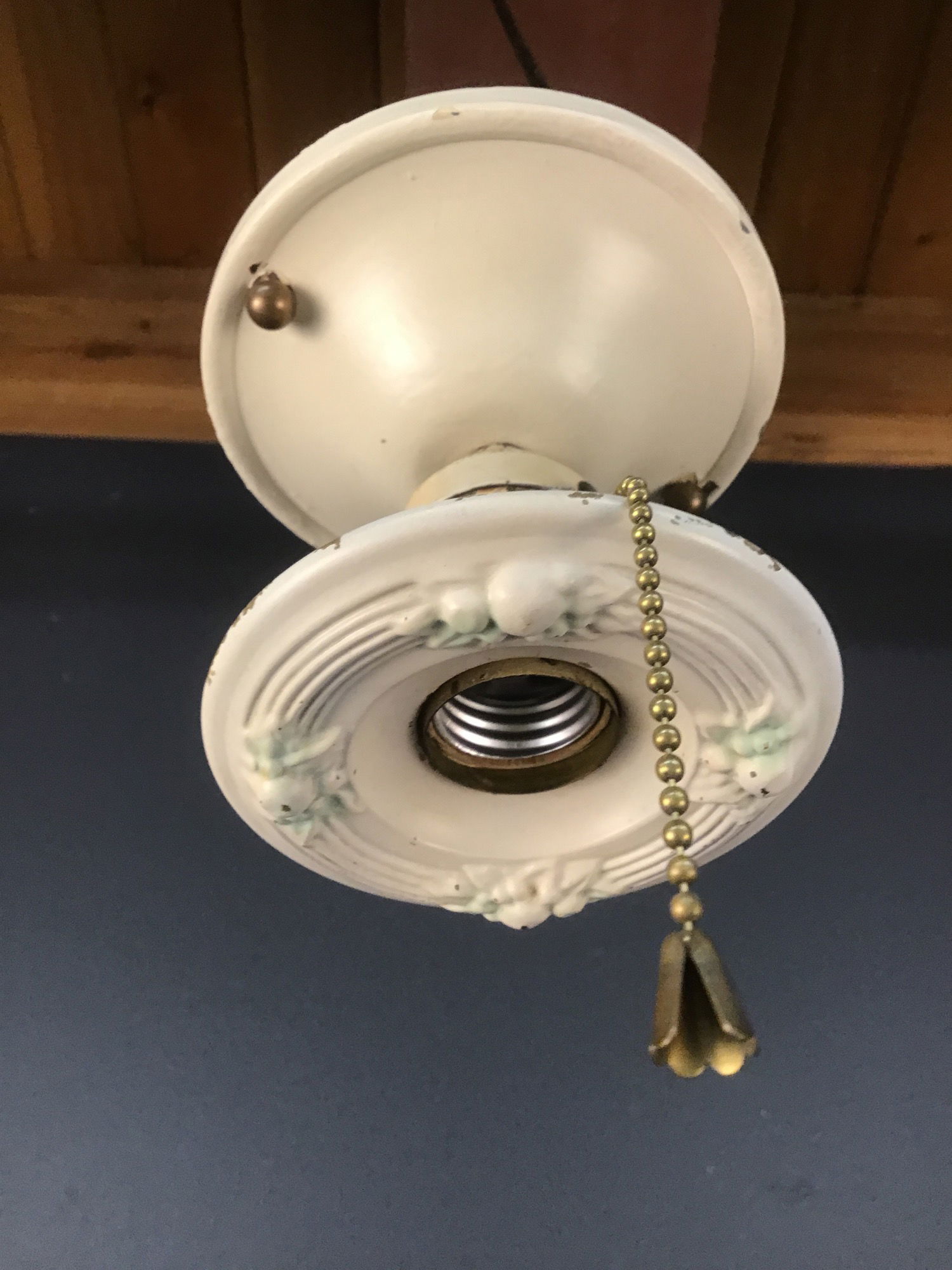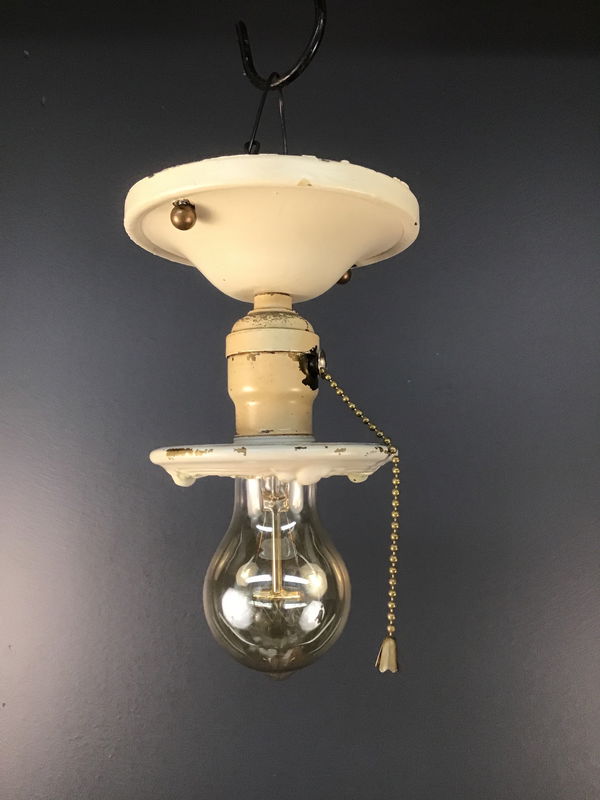 Polychrome semi-flush bare bulb ceiling light from the early part of the 20th century. Restored in Second Use light workshop for pullchain. Some chipping of the original polychrome paint.