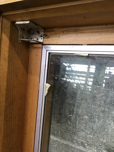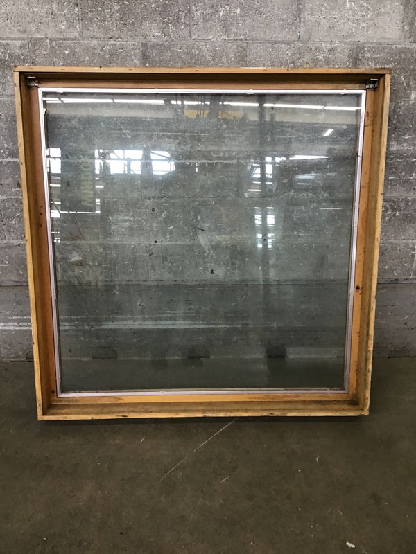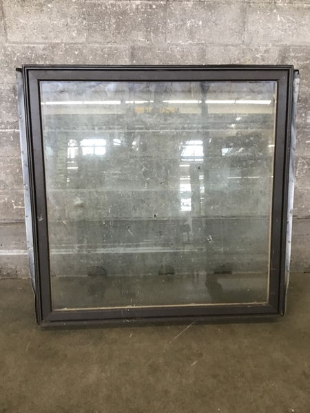 Older alum clad single pane picture window with brown exterior and raw wood interior. Has a storm window clipped in that needs a cleaning (this is not a true insulated glass unit). Otherwise in good condition.