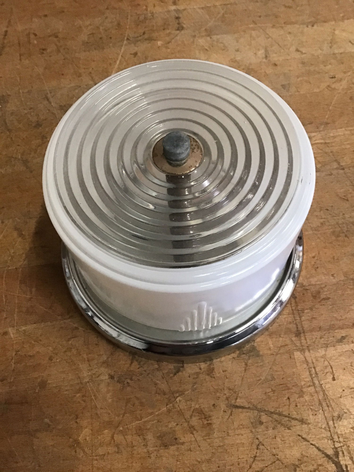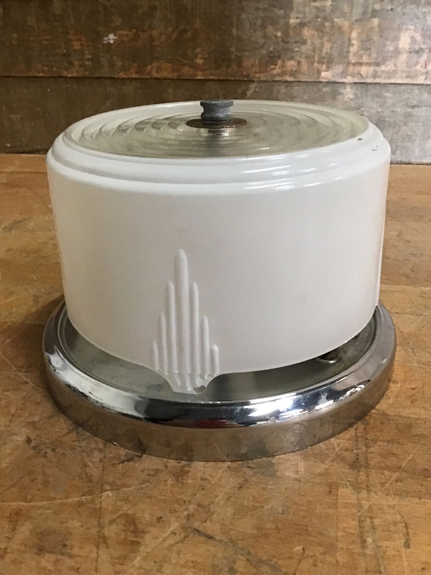 Vintage flush mount light in pretty good condition! This features a sweet little dual opacity shade, similar to a "cake" light, but with four little bump outs to separate it a bit from the chrome finished canopy. Wiring looks old, but in good condition, though we always recommend a full test prior to installation.
