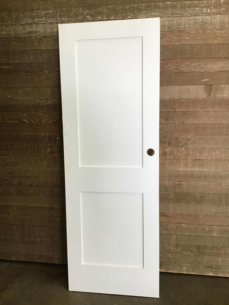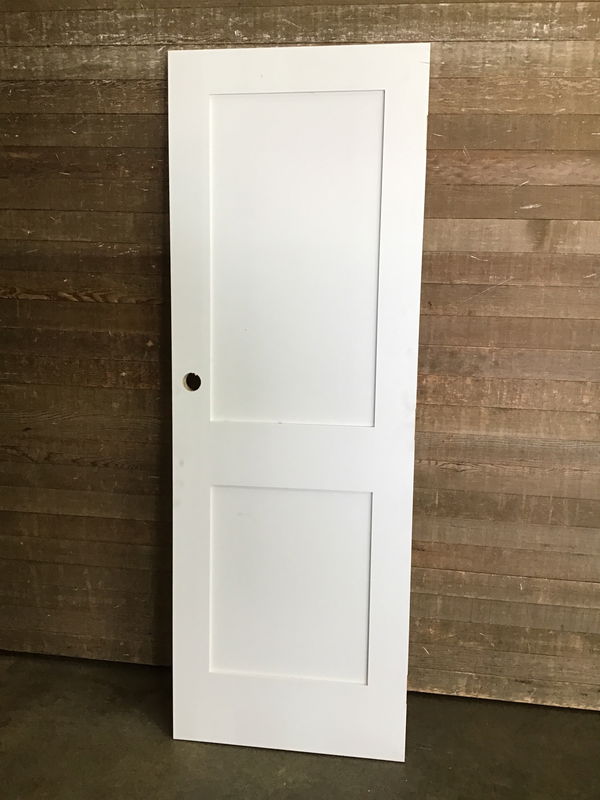 Primed MDF skin interior shaker style door. In great shape, just has really high placed hardware bore.