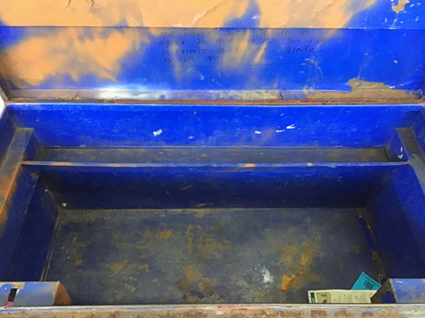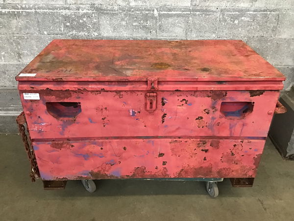 Burly, battle worn Jobox that is still ticking! It has seen heavy use but the interior is cleaned out and appears dry/unaffected by water episodes. It has to be locked with a separate chain and padlock, the original loops for a padlock have been cut.