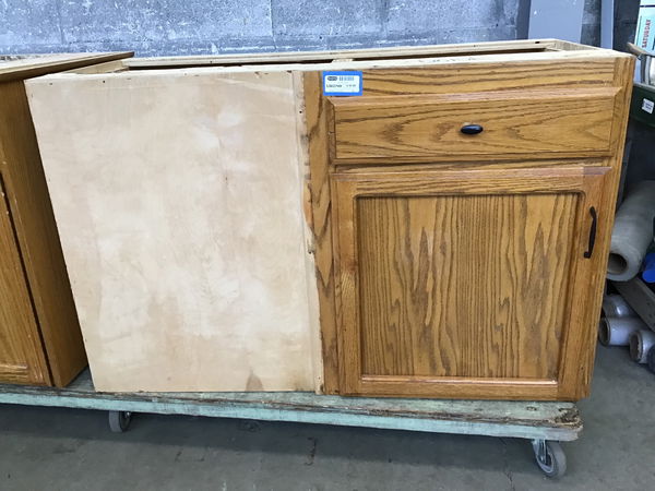 Oak base cabinet with a plywood box, has a blind corner on one side. Would make a great shop cabinet.
