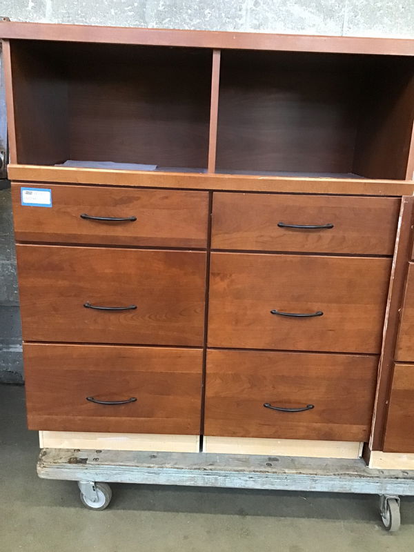 Funky cabinet unit with two sets of drawers under a pair of cube shelves. Particleboard box with a dark stain on the face. Would look great as a display cabinet!