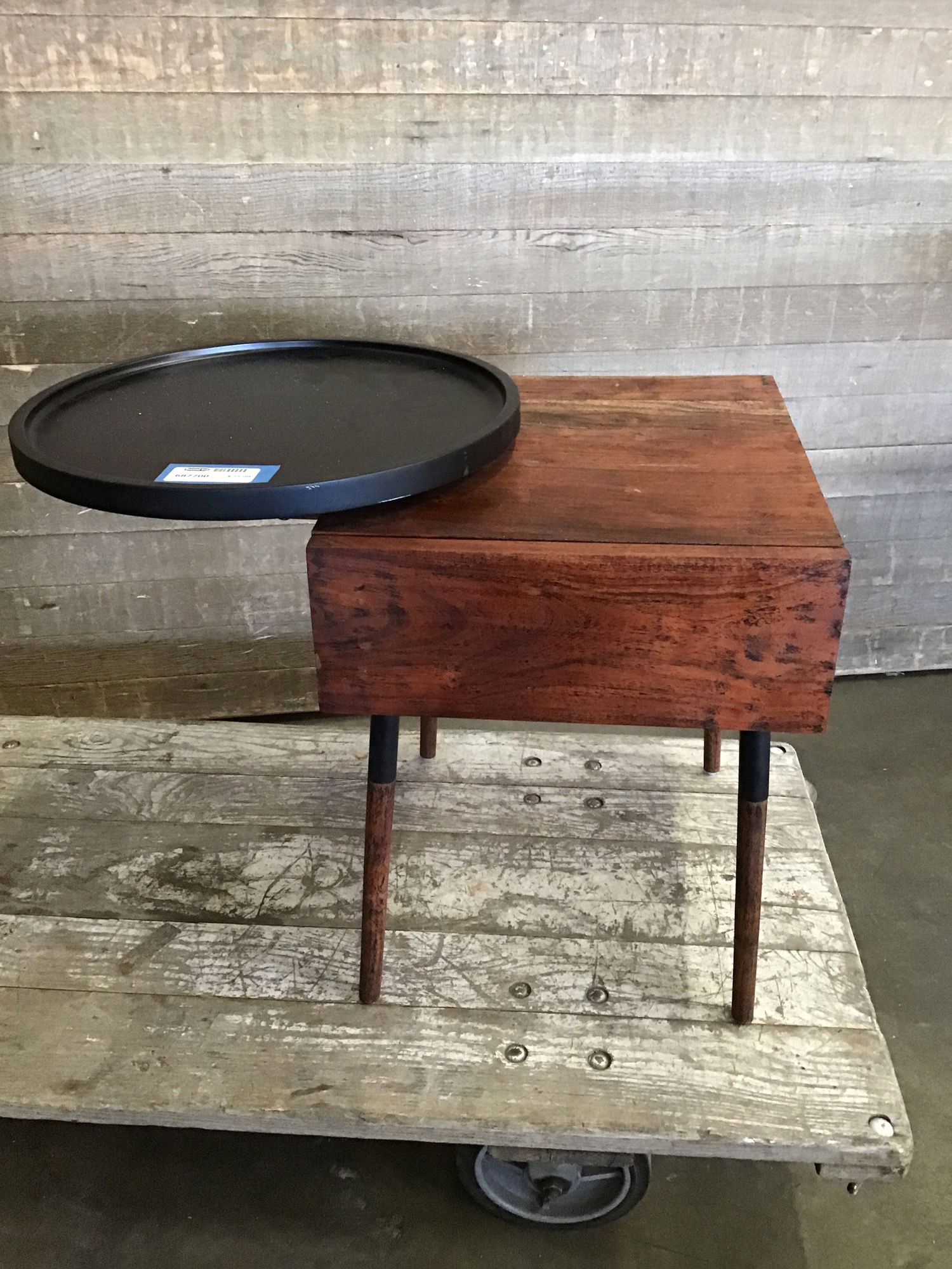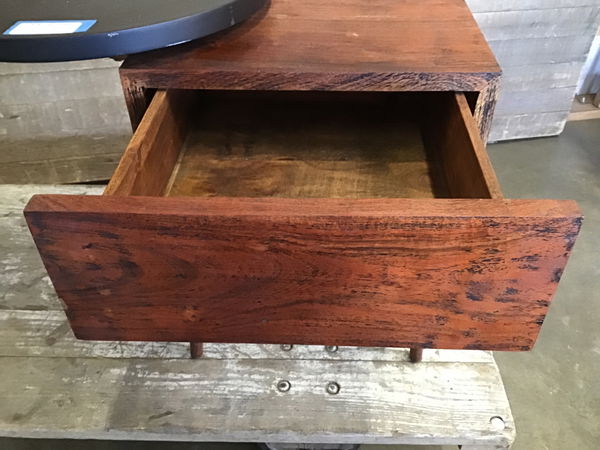 Cute side table made from solid Jatoba with a round platform. Single drawer. The Jatoba has a neat dark stained distress finish. The round thing doesnt spin and is slightly damaged. could easily be repaired with wood glue.