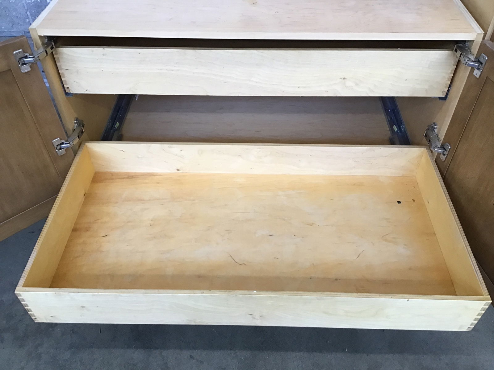 Well-built plywood cabinet with hardwood face. Has two dovetailed full-extension pull-out drawers inside. Seems like it was once part of an island or peninsula, and had a cooktop mounted on it. It could be used the same way or repurposed however you wanna use it. Just needs a toe kick and it's ready to go!