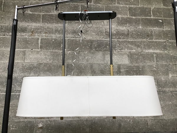 This 8-bulb chandelier has a wide linen shade and has a matte black finish with gold accent hardware. A modern look for your dining area or living space.