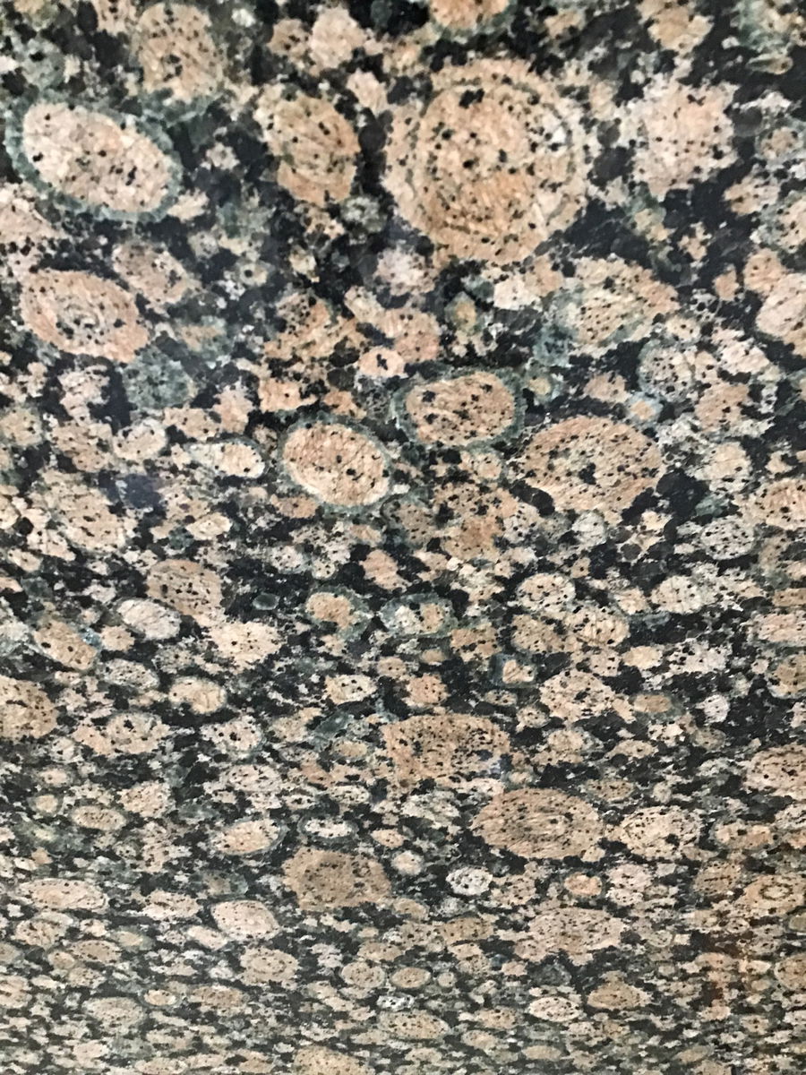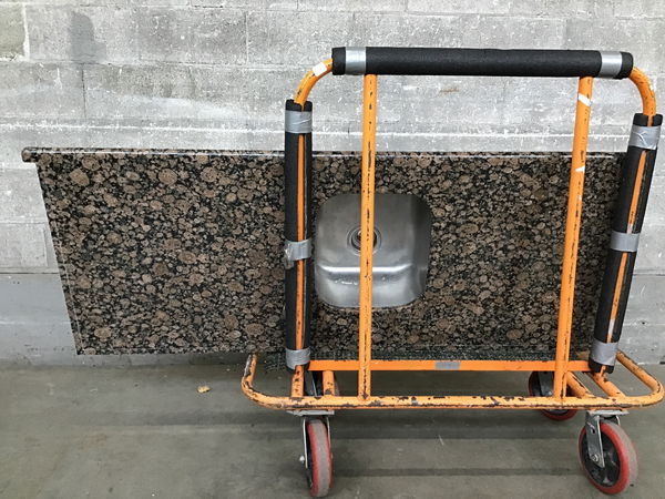This is a granite countertop with one finished edge, mounted on plywood, with an undermount stainless steel sink. Sink cutout is 15.5" x 13"
