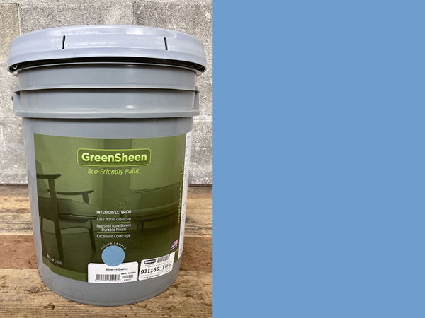Five gallons of Blue GreenSheen house paint. GreenSheen paints are made from 100% reclaimed materials. They process the paint that Washington residents recycle with the PaintCare program! GreenSheen is a quality eggshell finish paint that is available in a wide range of colors and costs much less than traditional paints. Their reclamation and cleaning process produces an interior/exterior house paint that is naturally lower in VOCs and provides exceptional coverage and durability. Check out our full selection of 18 different colors, available in one or five gallon sizes. Learn more about GreenSheen here.