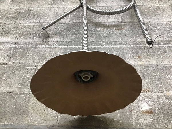 Industrial chic meets enchanted garden in this moderately absurd aluminum light with a floral, dusty rose shade by Rab Electric. This has a mounting arm and generous coil of conduit so you can adjust its hanging height. Photo may be representational.