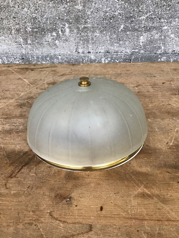 This is a vintage 1940's flush mount light with a brass fitter and a semi-obscured shade. Will need to be rewired
