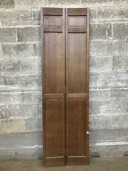 A beautiful six panel bi-fold door with CVG fir construction that's been given a nice, deep stain the color of a good cup of coffee- black as midnight on a moonless night.