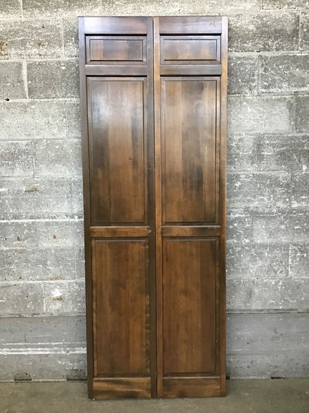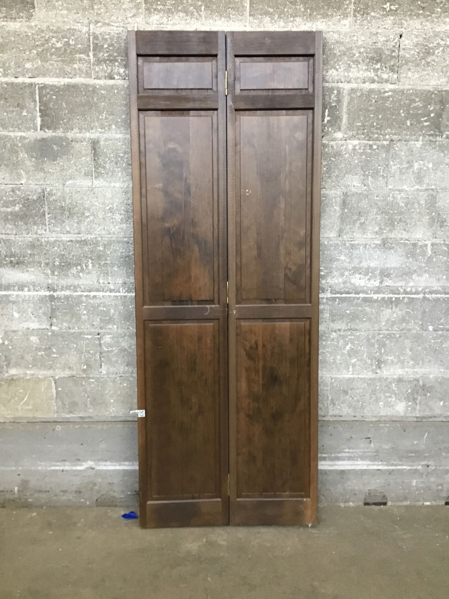 A beautiful six panel bi-fold door with CVG fir construction that's been given a nice, deep stain the color of a good cup of coffee- black as midnight on a moonless night.