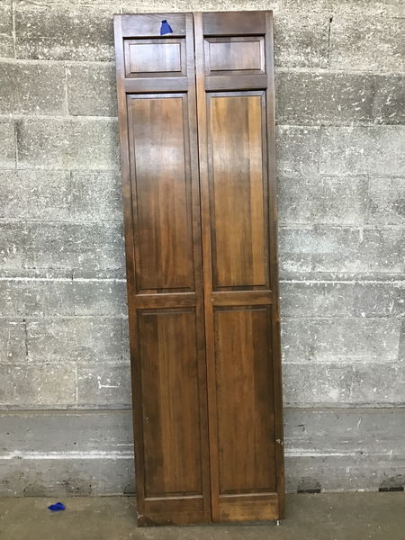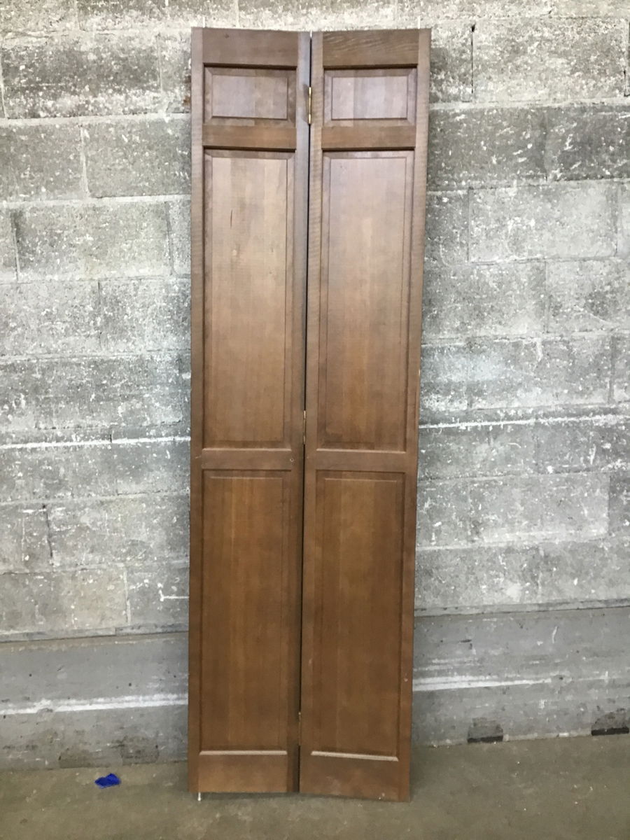 A beautiful six panel bi-fold door with CVG fir construction that's been given a nice, deep stain the color of a good cup of coffee- black as midnight on a moonless night.