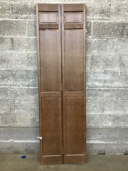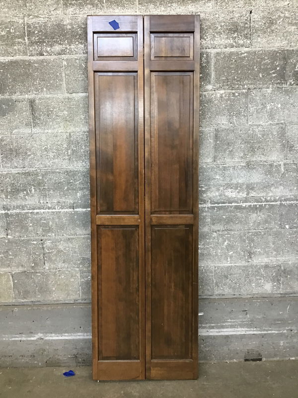 A beautiful six panel bi-fold door with CVG fir construction that's been given a nice, deep stain the color of a good cup of coffee- black as midnight on a moonless night.