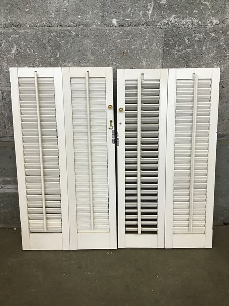 Pair of bi-fold louvered shutters painted white with brass knobs and latch.