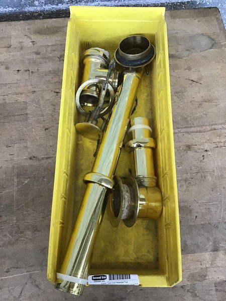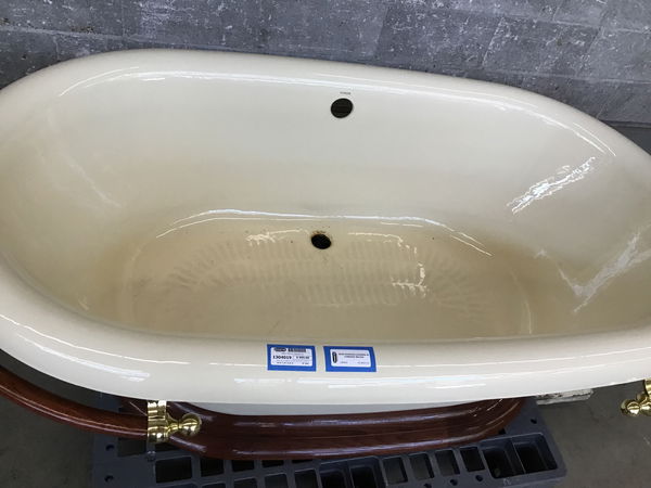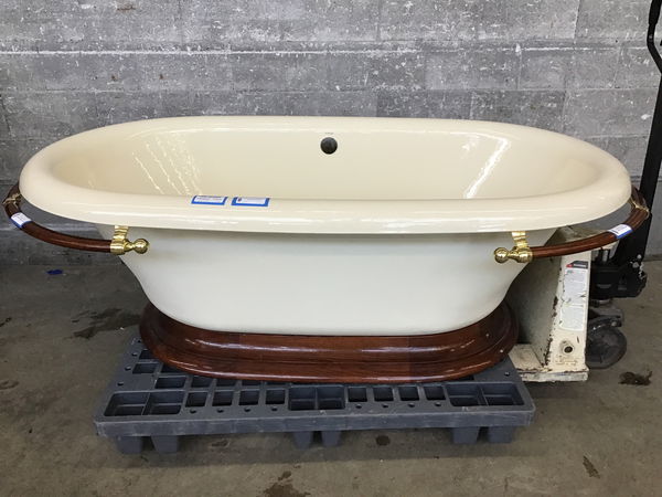 Kohler cast iron pedestal tub with biscuit finish, wooden towel bars on either end, and brass drain hardware. Looks to have been hardly used.