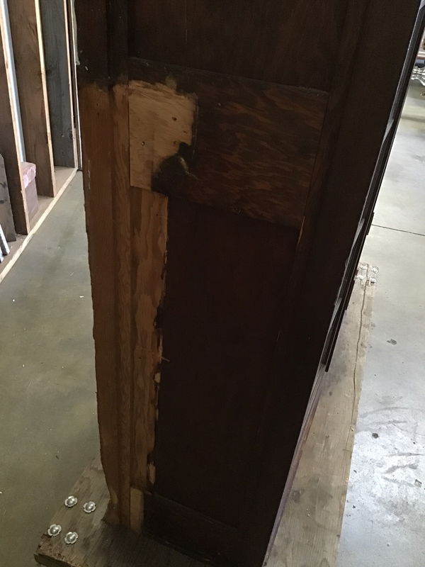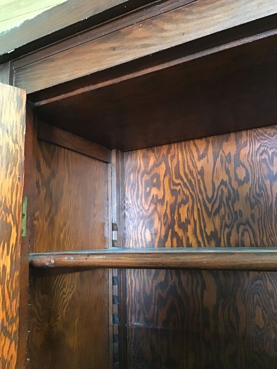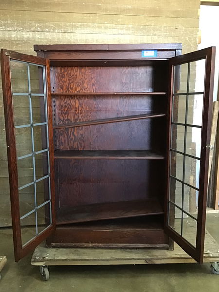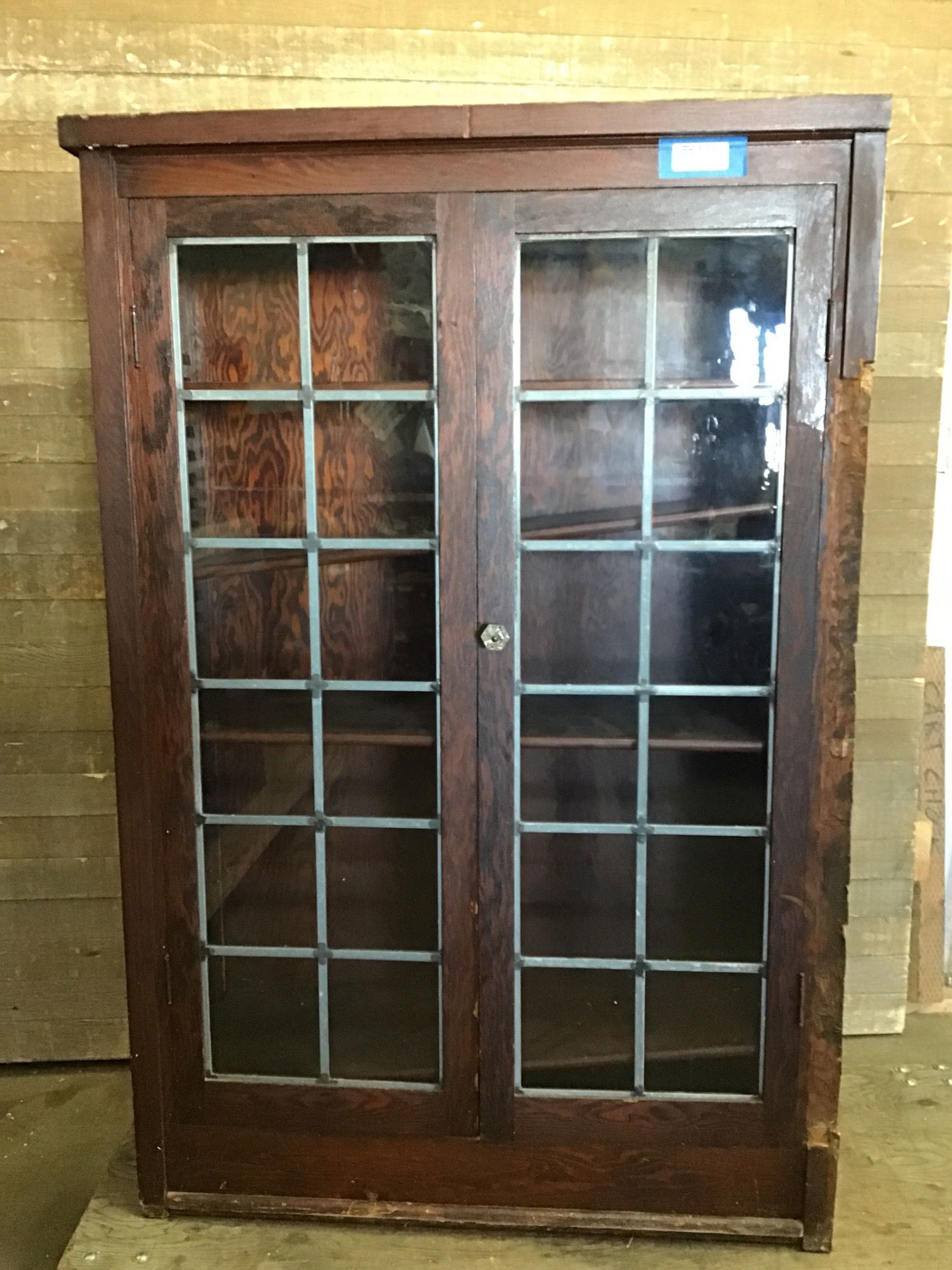 This is a beautiful flat-grain fir display cabinet circa 1930's. It has a gorgeous pattern from the flat-grain, has 4 adjustable notched shelves, a vintage glass cabinet knob, flat leaded partition dividing 12 glass pane on either door, and vintage ball hinges inside the doors. The left side is finished while the right side is not. This one has a slight bit of damage on the left side from when it was removed but is easily fixable and overall in pristine condition. Measurements reflect overall footprint.