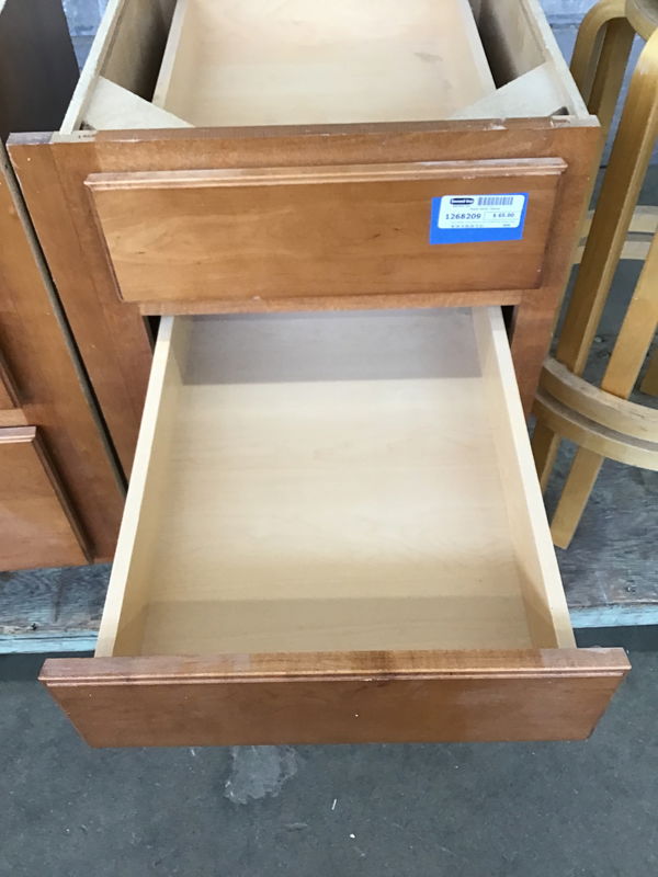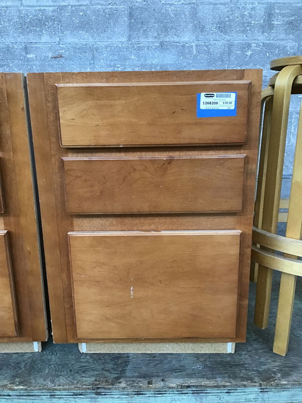 Three drawer vanity base cab with almost-flush drawer faces and a dark stain. Width does not include trim piece on front face.