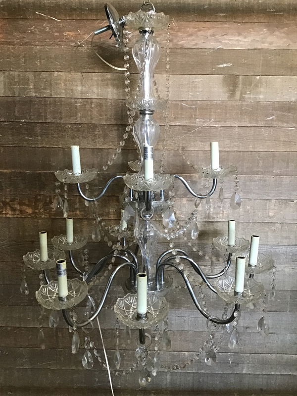 Large chandelier with crystals galore and a polished nickel finish frame. Has been rewired and all the crystals are there! We gave it an initial cleaning but it could use another wipe down.