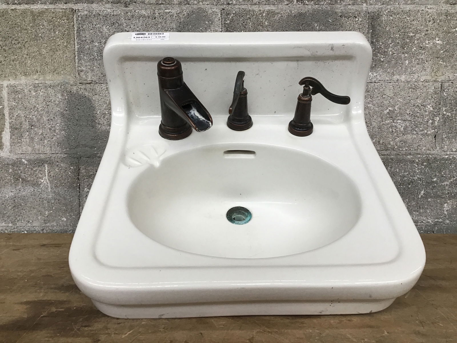 Wall mount porcelain bathroom sink with antiqued brass faucet.