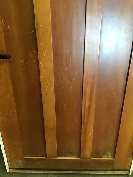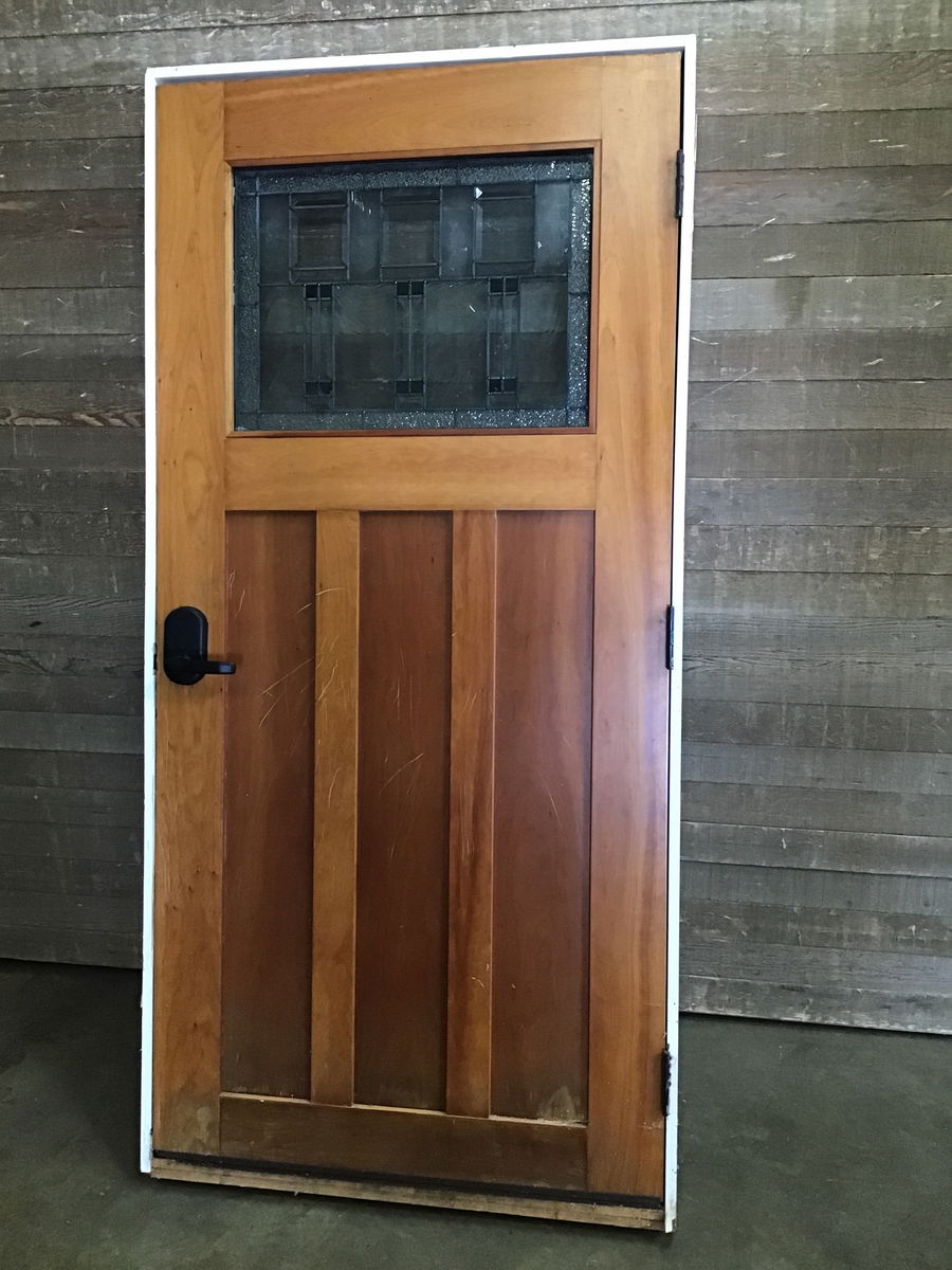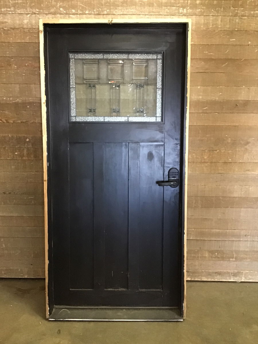 Very pretty exterior door with a small leaded lite at top and a stained Cherry interior and black painted exterior. There are 3 shaker panels under the lite. The leaded lite has obscured, colored, and beveled glass panes, and is quite modern in style. The glass is stamped 1984. Comes prehung with threshold. There is a bit of scratching from a good dog on the interior, but these should be easily covered up. Also a little on the short side at 75.25" tall, not including jamb/threshold.