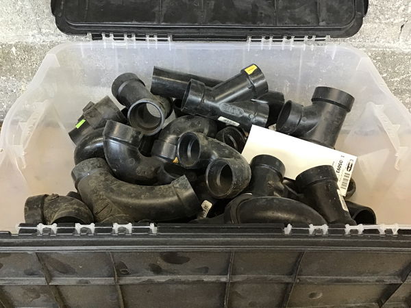 Good mix of mostly 1 1/2" and 3" ABS fittings that haven't been glued at all. Estimating about forty pieces in the box--plus a few useful pipe tails. SOLD AS A SEALED TOTE ONLY!