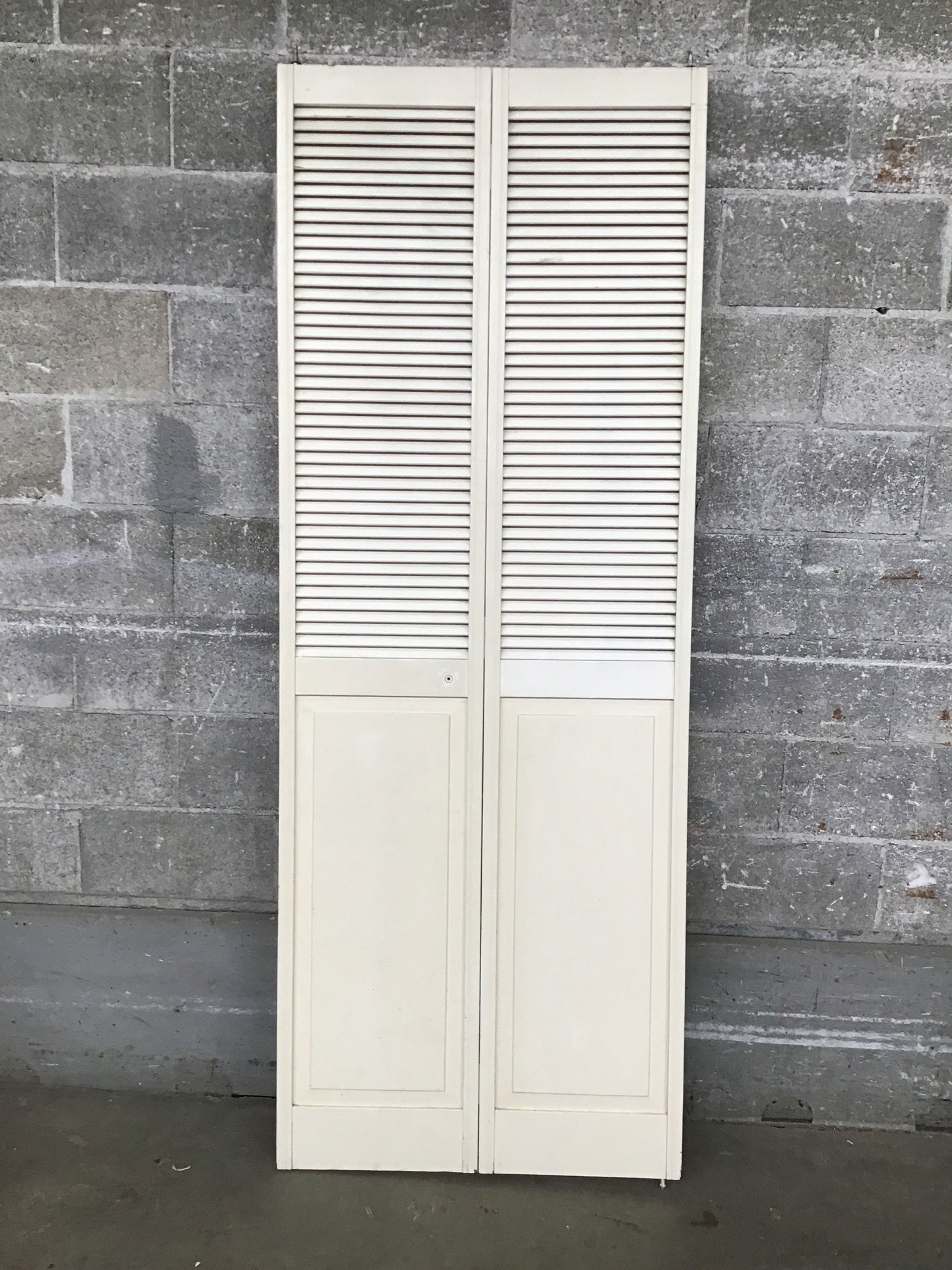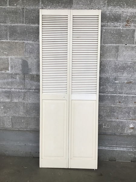 Louvered Bi-fold door with a Beige paint job. Each door has a panel and overall seems to be relatively clean.