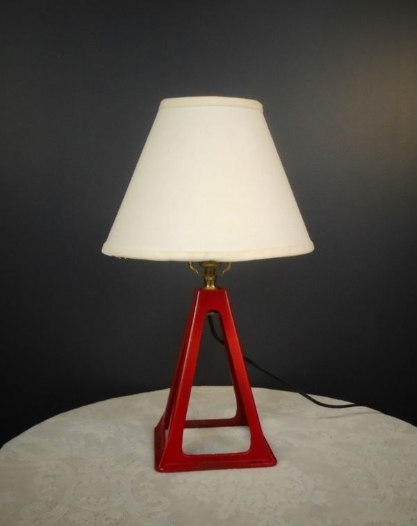 An old car jack stand that has been painted red, and repurposed into a stylish table lamp. Comes with an 11" lamp that has some scorching, so that is thrown in for free with the lamp, if you would like it. Lamp was built in our on site light repair workshop.