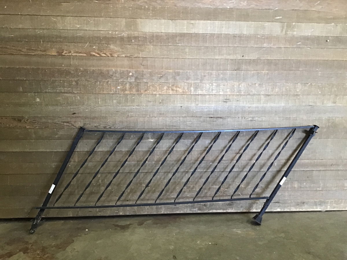 Not up to code, the spindles are farther than 4" apart. One of the posts has been rusted at the bottom so would need to be mounted on something, or just used as a garden trellis.