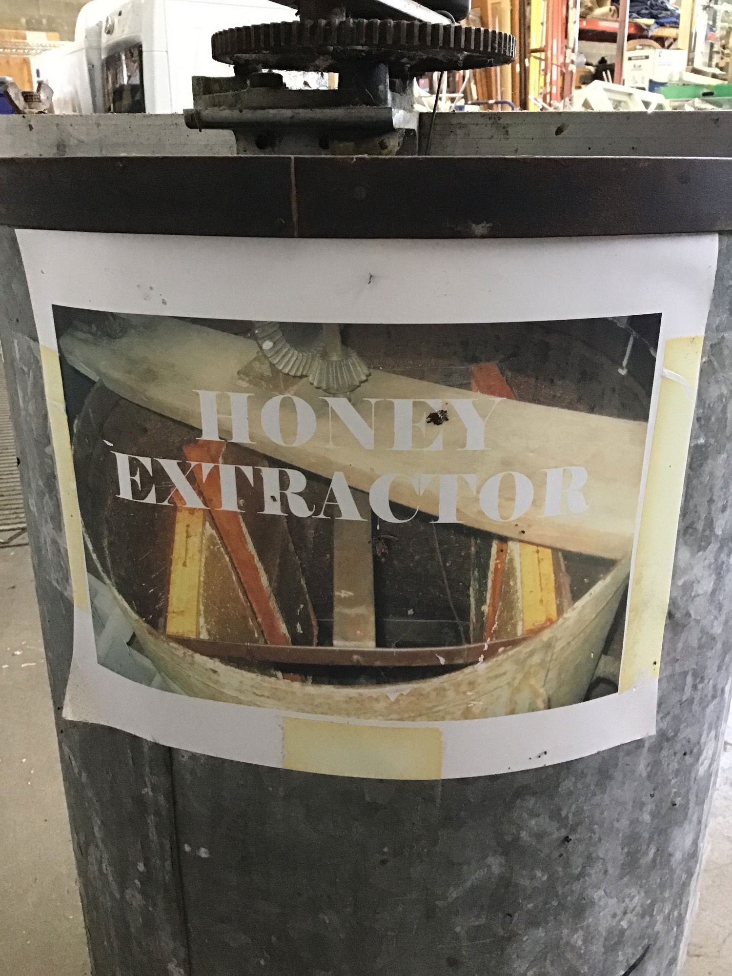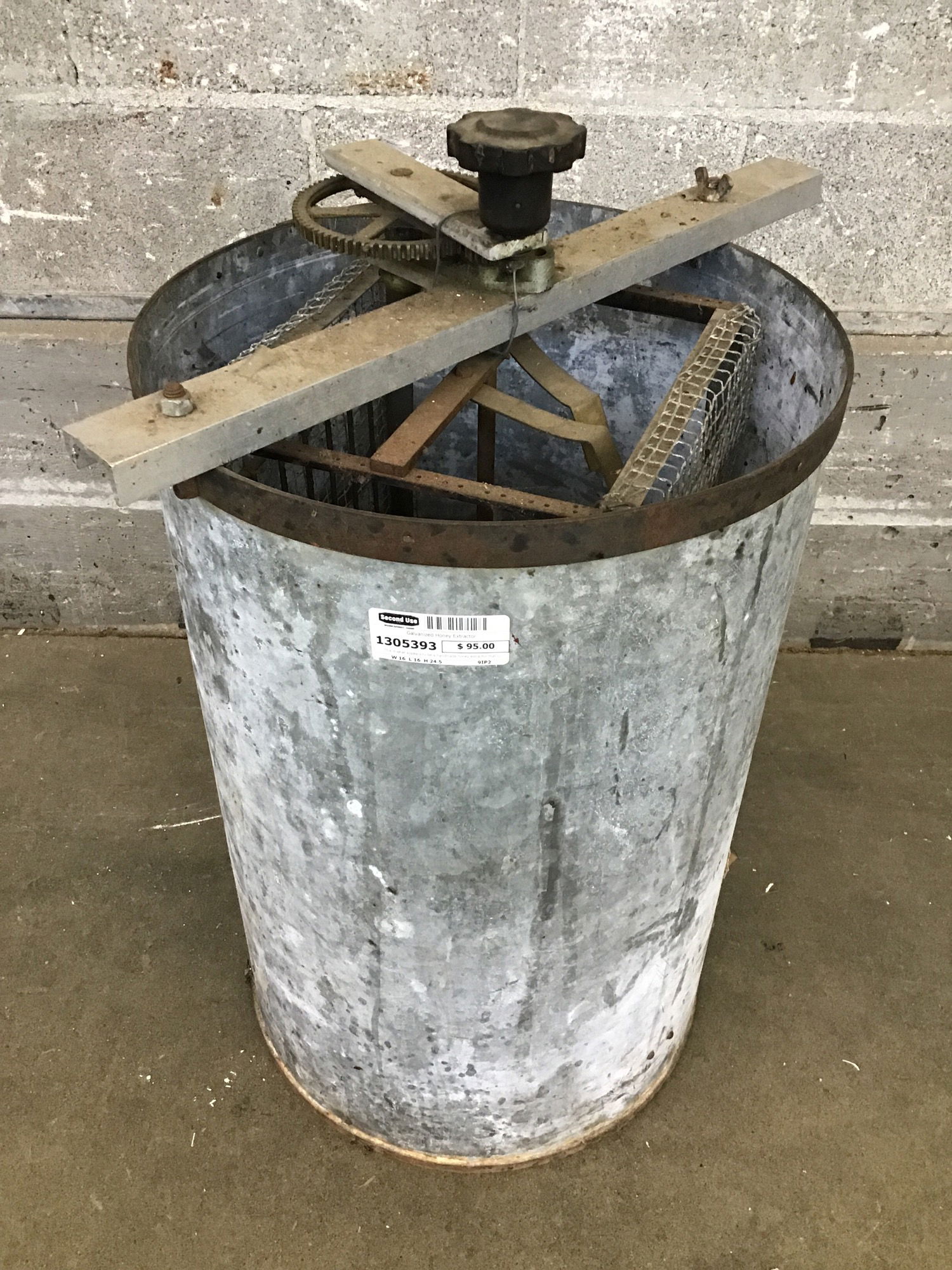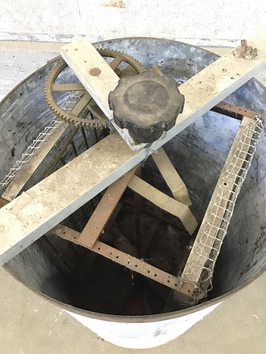 This is what appears to be a handmade honey extractor that uses centrifugal force to extract honey from the honeycombs. Will need a cleaning if you plan on using it for honey extraction. WARNING: may contain the vengeful ghosts of a thousand bees.