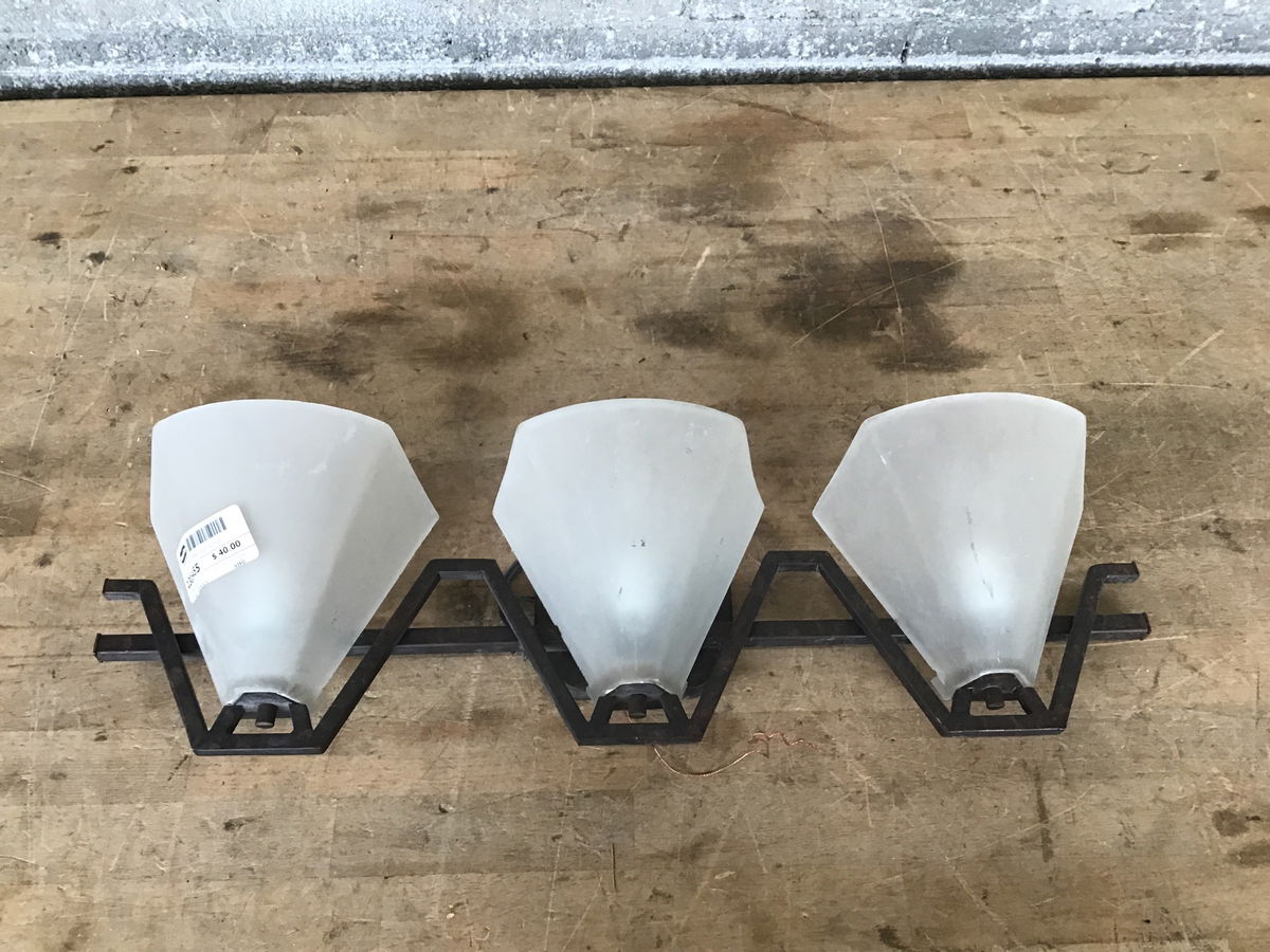 A modern three bulb sconce for your wall. Features a metal frame with an industrial look, frosted shades and is suitable for dry locations. This would make a great entryway or hallway sconce.