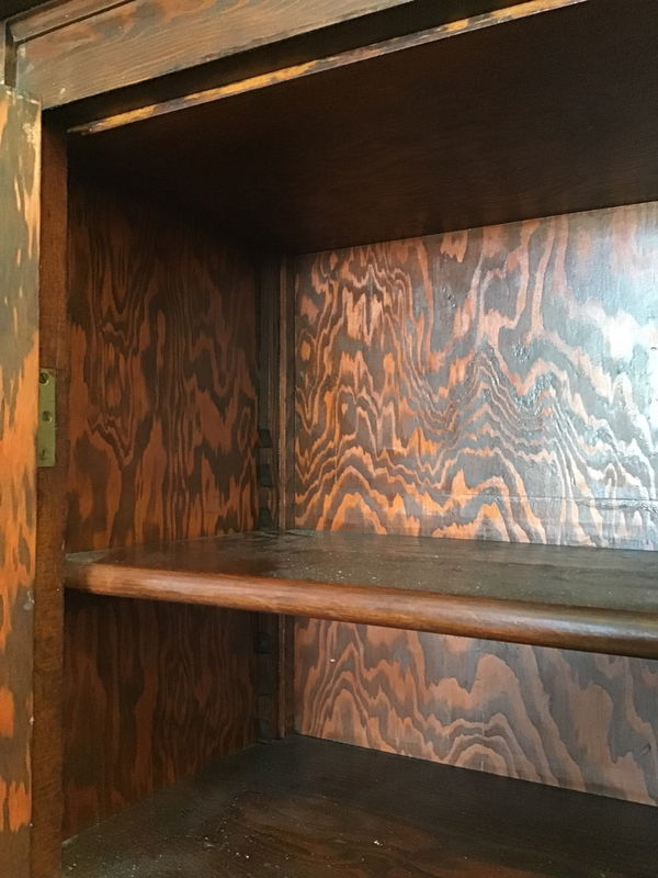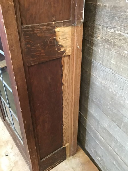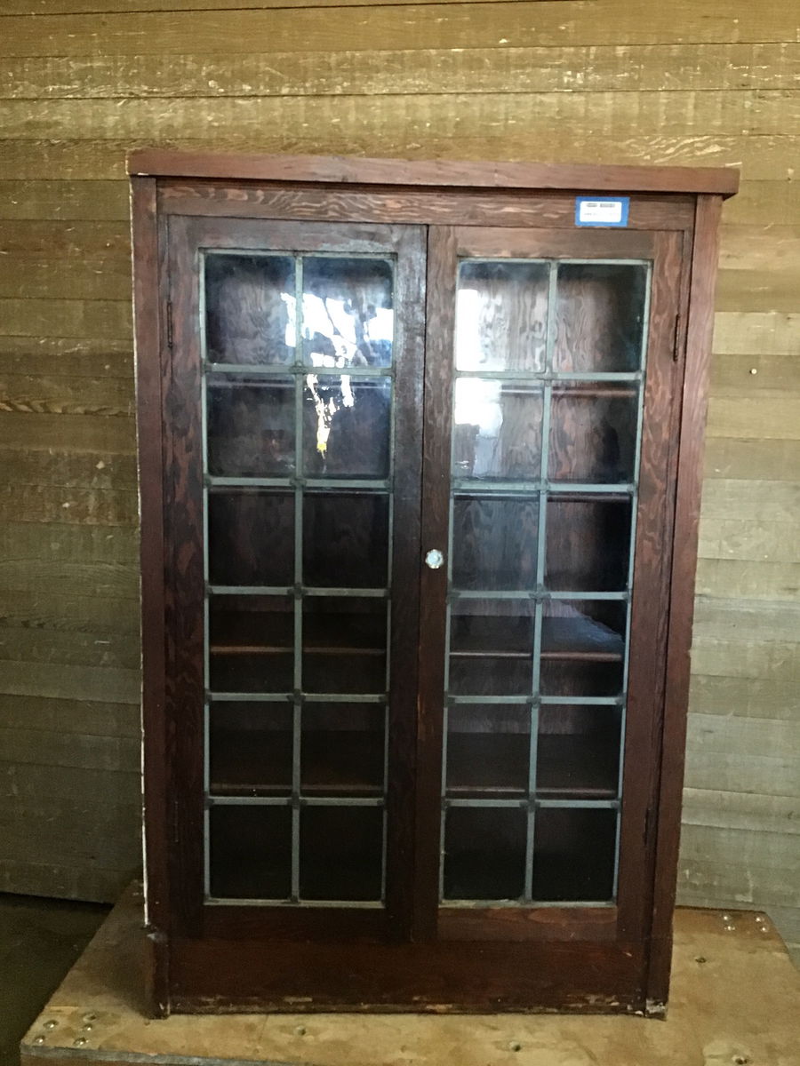 This is a beautiful flat-grain fir display cabinet circa 1930's. It has a gorgeous pattern from the flat-grain, has 4 adjustable notched shelves, a vintage glass cabinet knob, flat leaded partition dividing 12 glass pane on either door, and vintage ball hinges inside the doors. The right side is finished while the left side is not. This one has a slight bit of damage on the right side from when it was removed but is easily fixable and overall in pristine condition. Measurements reflect overall footprint.