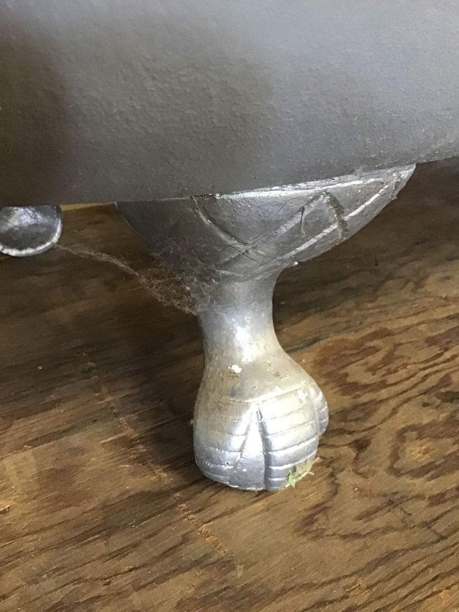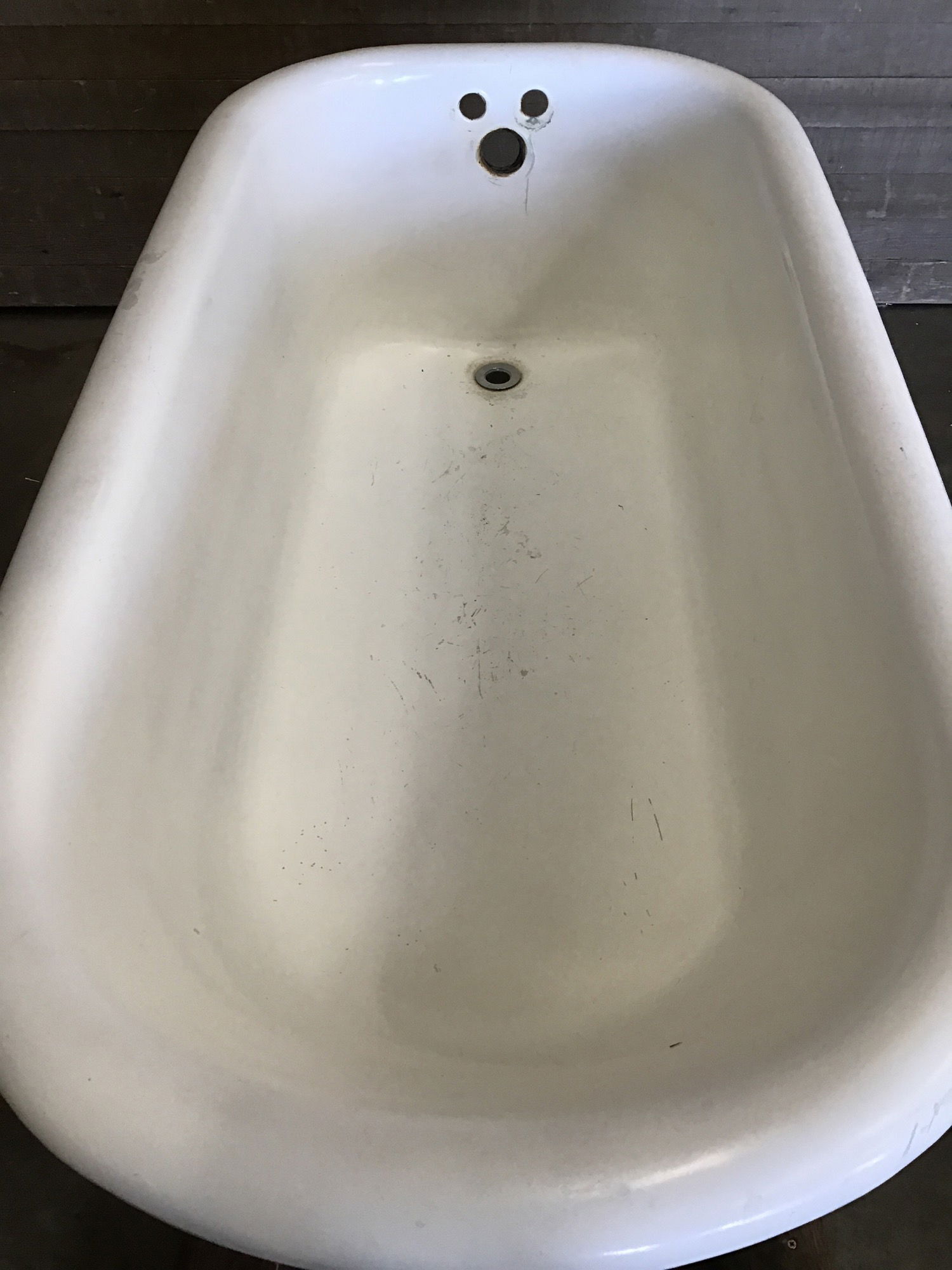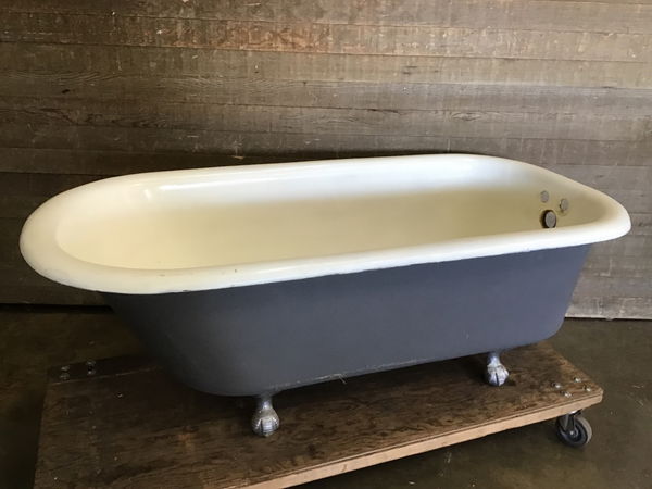 Nice cast iron clawfoot tub in good, used condition. Looks like it was refinished at some point and is starting to chip again. There's a lil' bit of rust around the rims, but nothing major. The outside has been painted gray and the clawfeet have been painted silver. They look to be in pretty clean condition overall though.