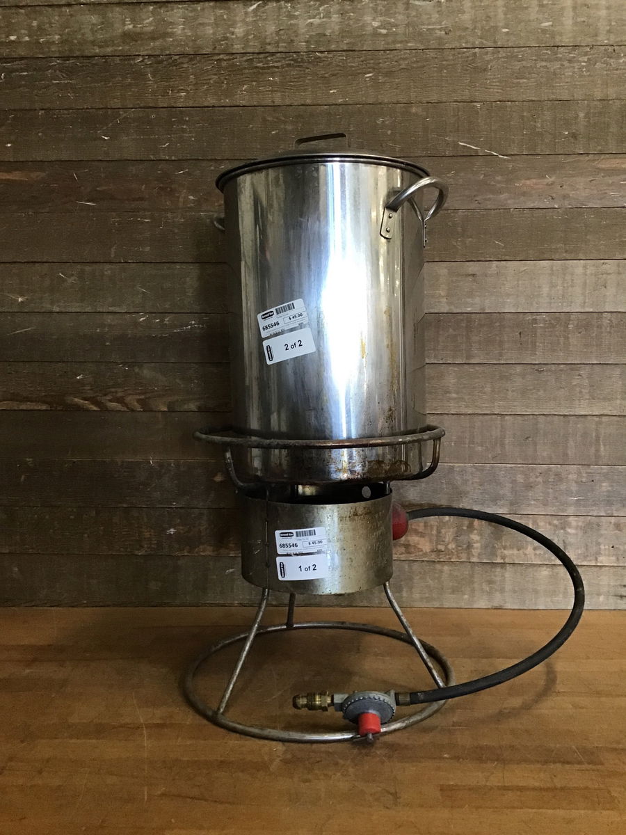 Outdoor propane burner with a turkey frying pot and parts for it. Dimensions listed are of pot.