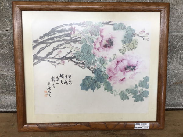 This is an oak framed painting of some peonies and some Chinese symbols.