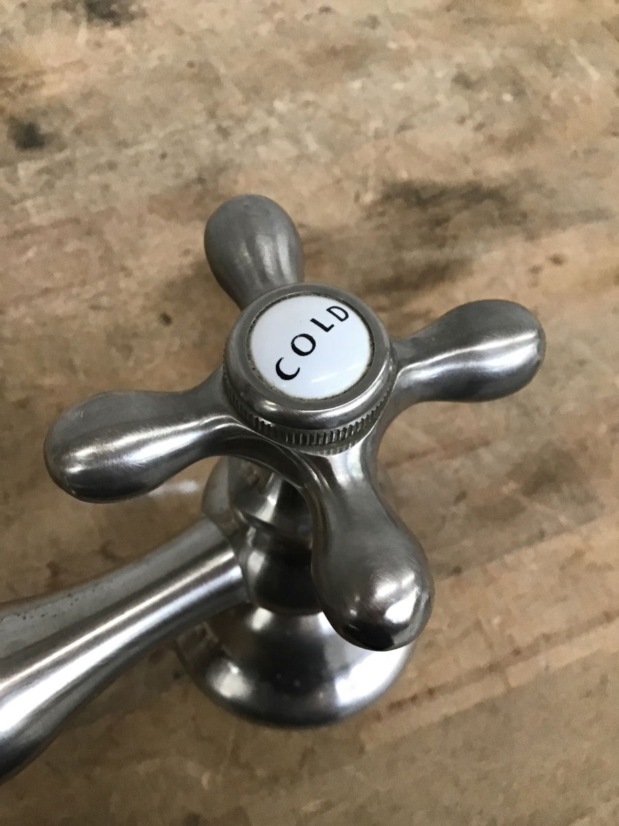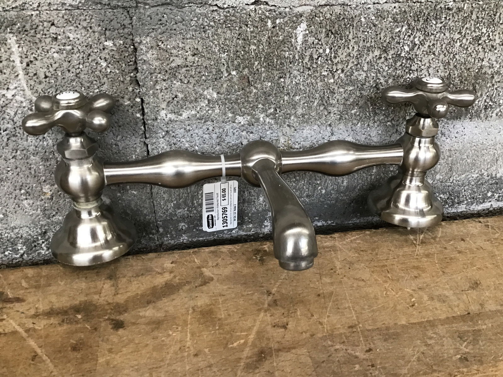 Reproduction of an antique widespread bathroom faucet with a brushed nickel finish. Even has "hot" and "cold" labels to boot! Feels like a washerless faucet with quarter turn valves.
