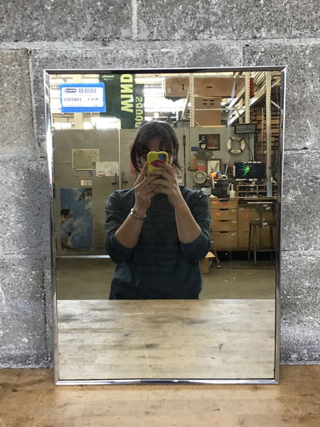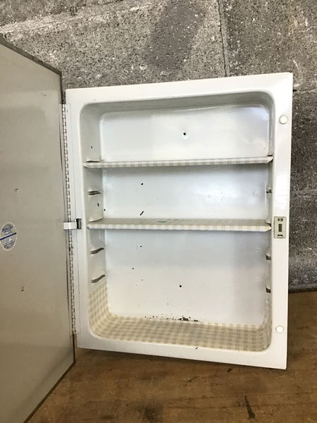 Built-in medicine cabinet with a metal box and two shelves inside.