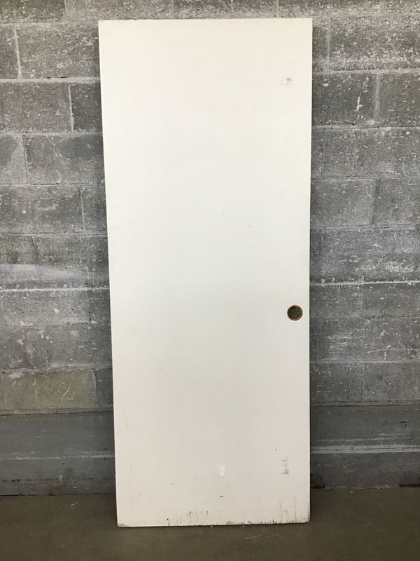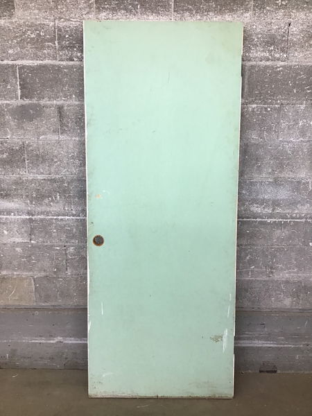 A hollow core slab door with exterior thickness, with one side painted white and the other a light, minty green.