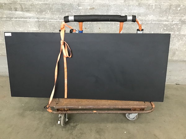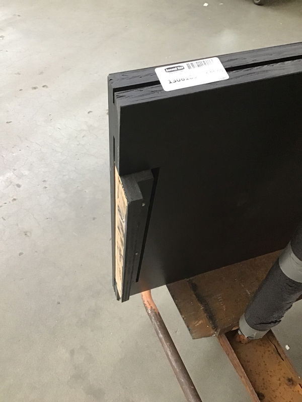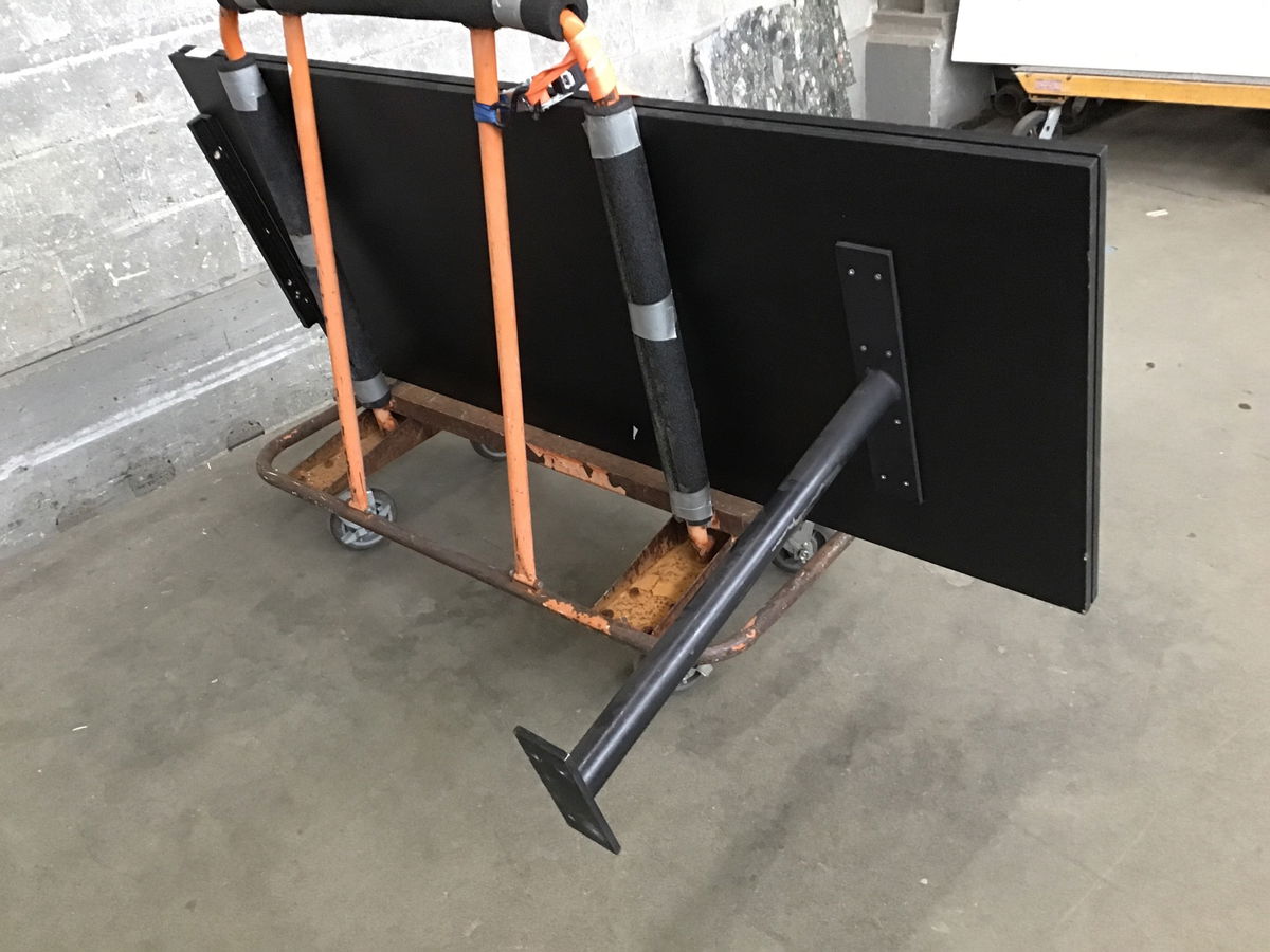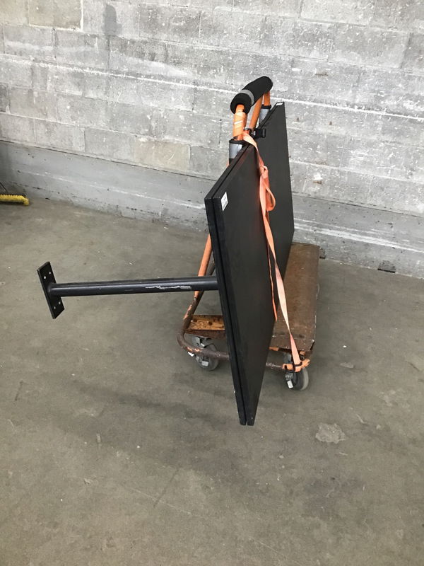Simple plywood table with black laminate top. Mounts to the wall on one side, supported by a super sturdy welded steel leg. Would be a great work bench !