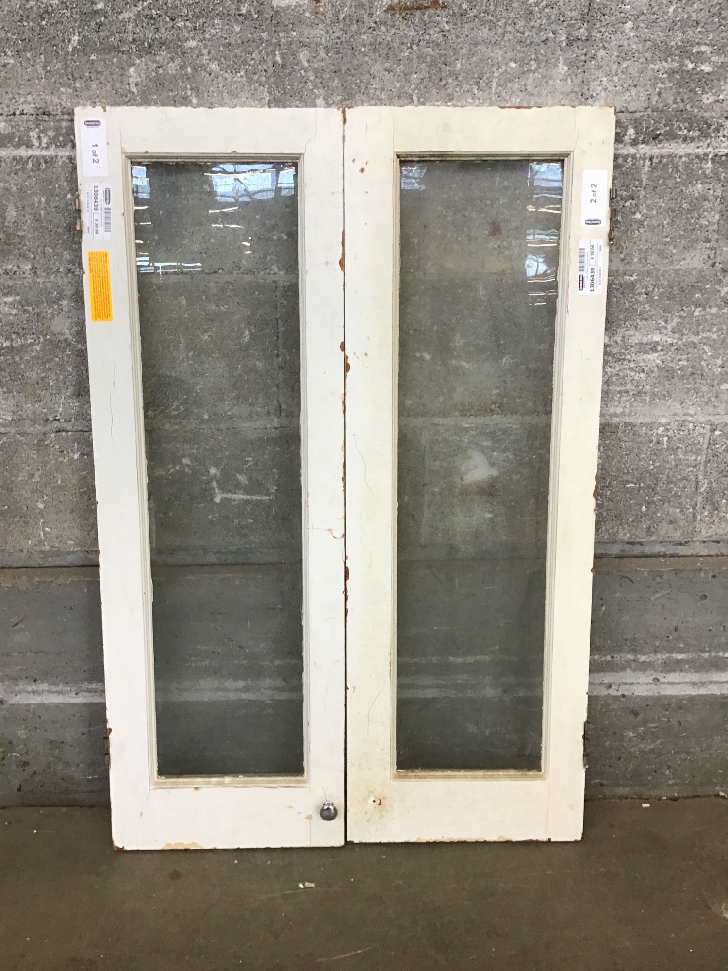Pair of Shabby-Chic glass cabinet doors. Restore or embrace the rustic appeal. May have lead paint. Priced reflects condition.